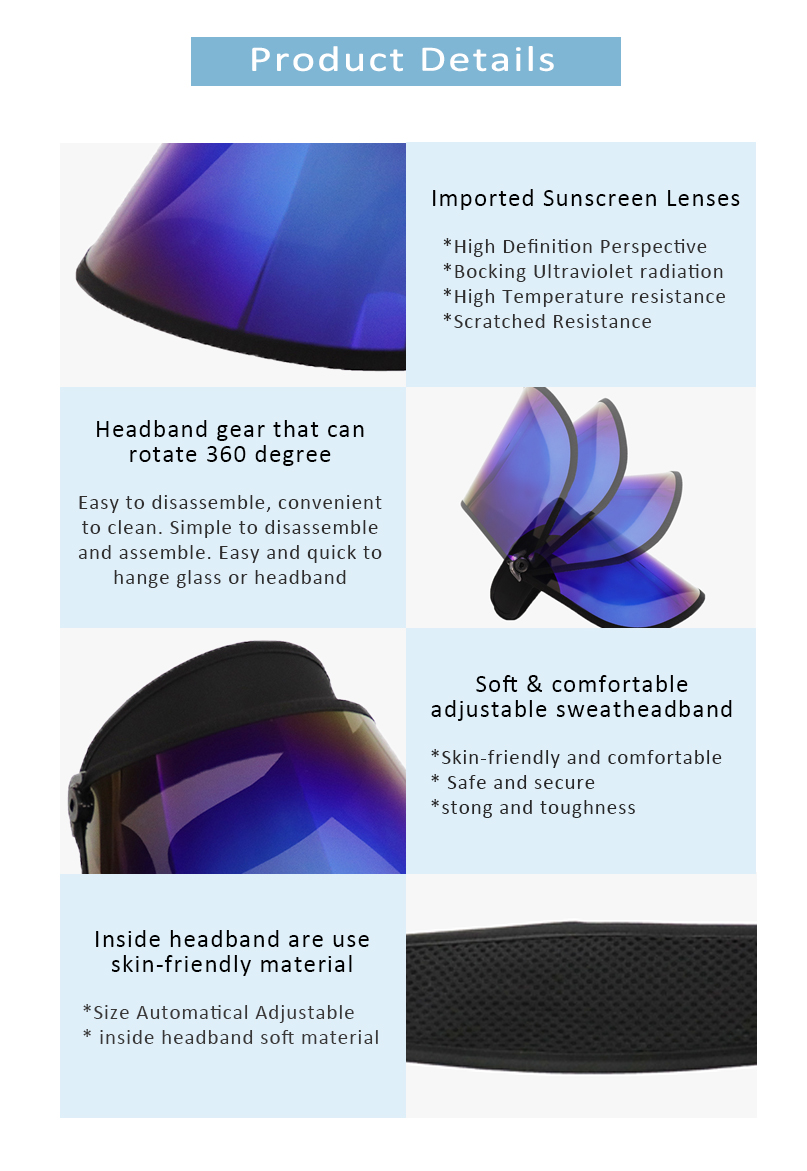 Our sun visor sunglasses use PC material,scratch resistance,high temperature resistance,more visible,UV ray protection.